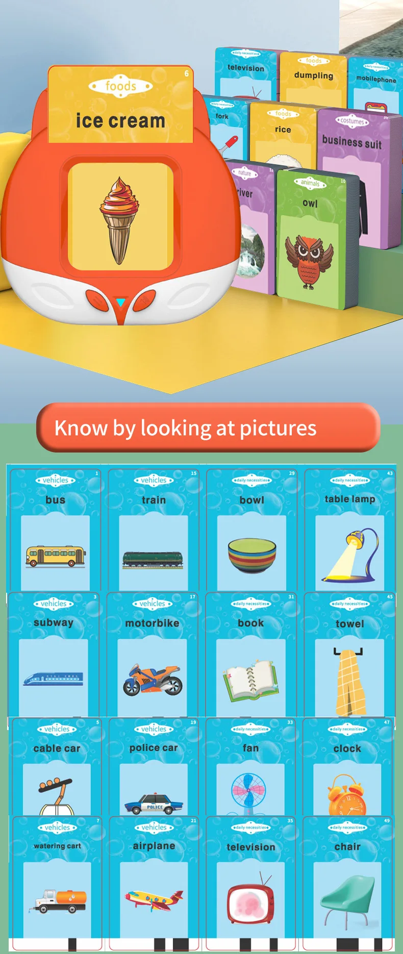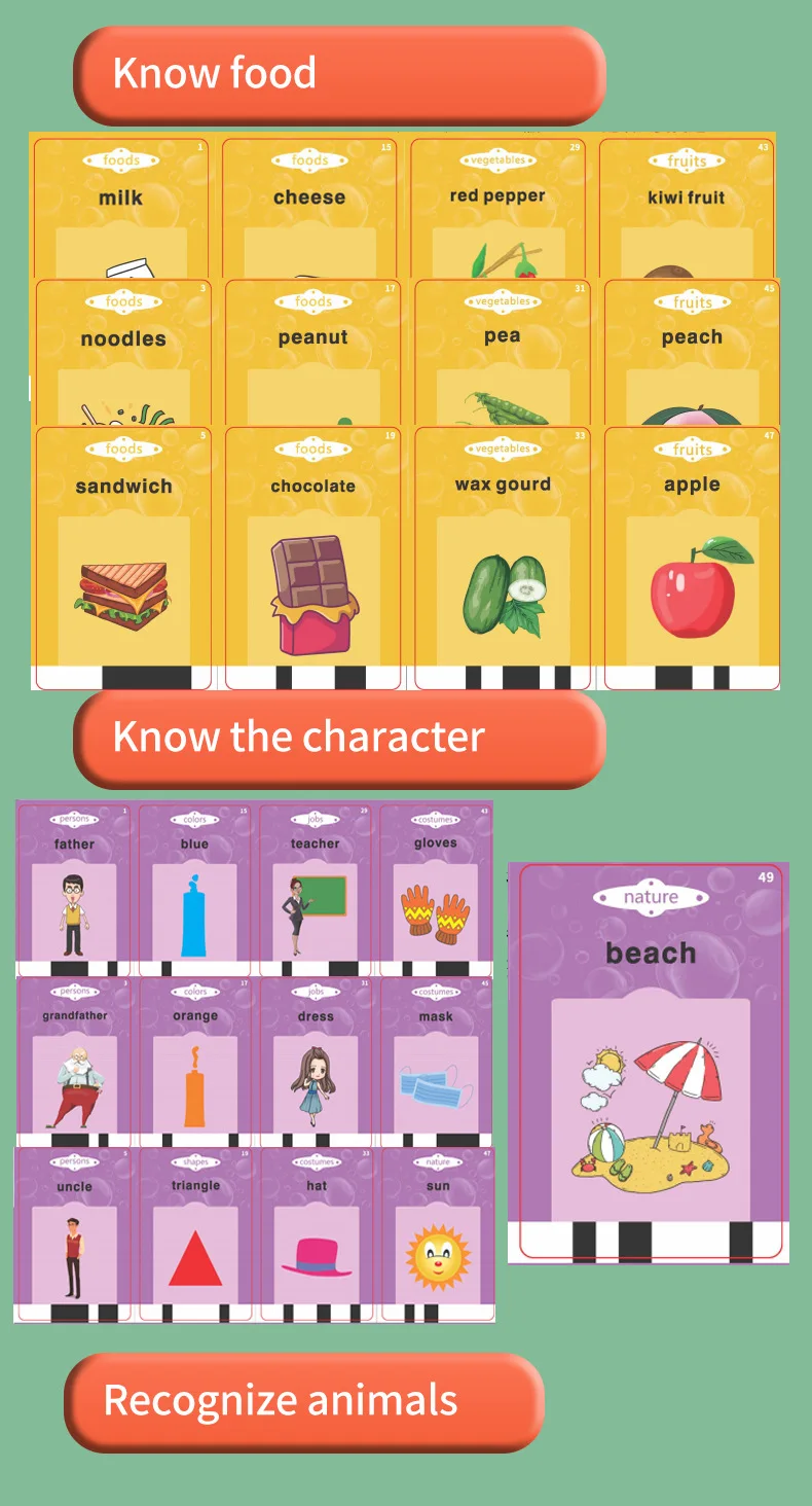 【Interesting Learning Experience with Talking Flashcards】- Give your kids interesting preschool learning toys! This early educational toys equipped with lifelike analog sounds for animals, cars, etc, ( Some cards don't have a sound effect ), humorous and cute pictures, and automatic pronunciation functions can effectively attract toddlers' attention and stimulate interest in learning.