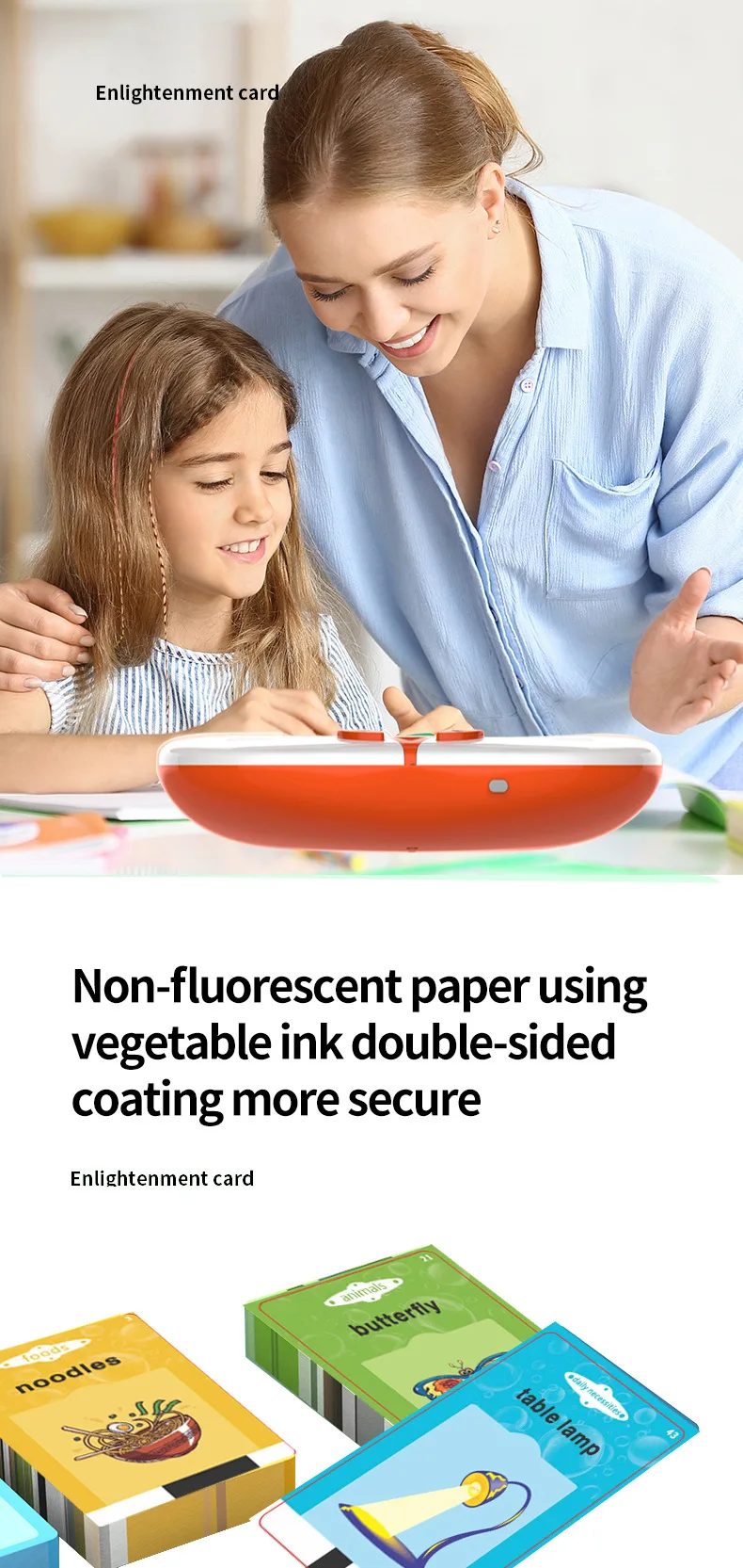 【112 Taking Baby Flash Cards】- Flash card set contains 224 uniquely designed double-sided flashcards and a reader. Through QR recognition, make each card sound. It is a great learning way for them to explore different possibilities, enhance cognitive ability and exercise hearing.