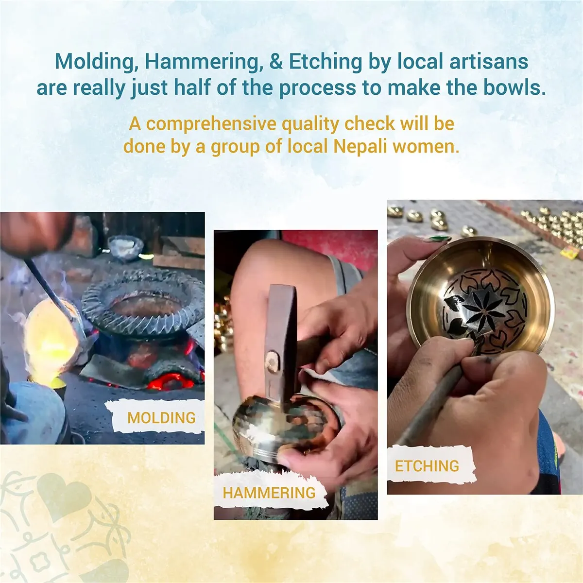 Hand Made by Local Artisans: Singing Bowls from Himalayan Healing are hand-hammered in the foothills of Nepal by local artisans. They possess special skills and experiences to give a perfect physical shape to such bowls. After all, the artisans are decided to create something that is as distinct as you are.