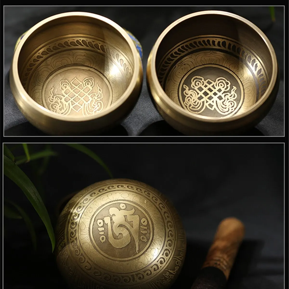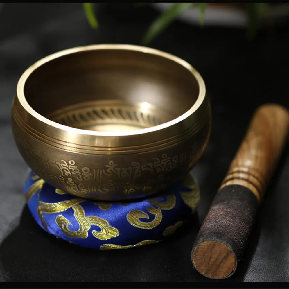 • Tibetan Singing Bowl Set Totem Sound Bowl Meditation Bowl Unique Gift Helpful for Meditation Yoga Stress Relief Gold Bowl