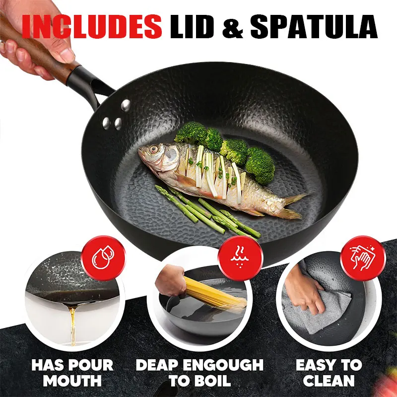 It is suitable for electric, induction stove, and gas stove. Can be used as wok pan, cast iron pan, Cast iron skillet, pan for cooking, cast iron cookware, easy cookware, wok and stir fry pan, nonstick frying pan, non stick wok, flat bottom wok, induction wok.
