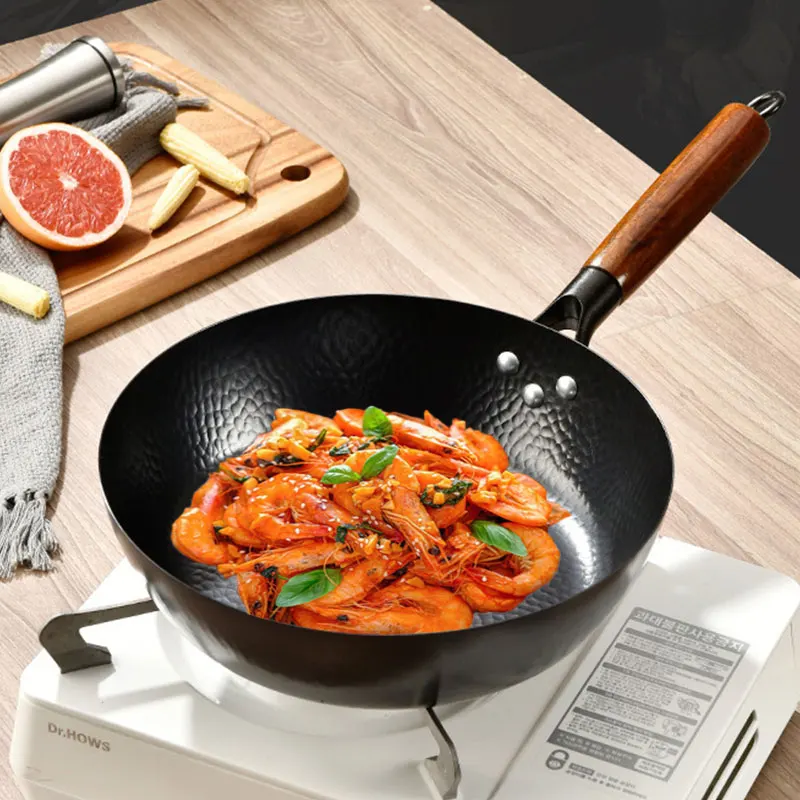 Stir Fry Pan With Wooden Handle Lightweight Cast Iron chef's pan pre-seasoned nonstick for Chinese Japanese and other cooking