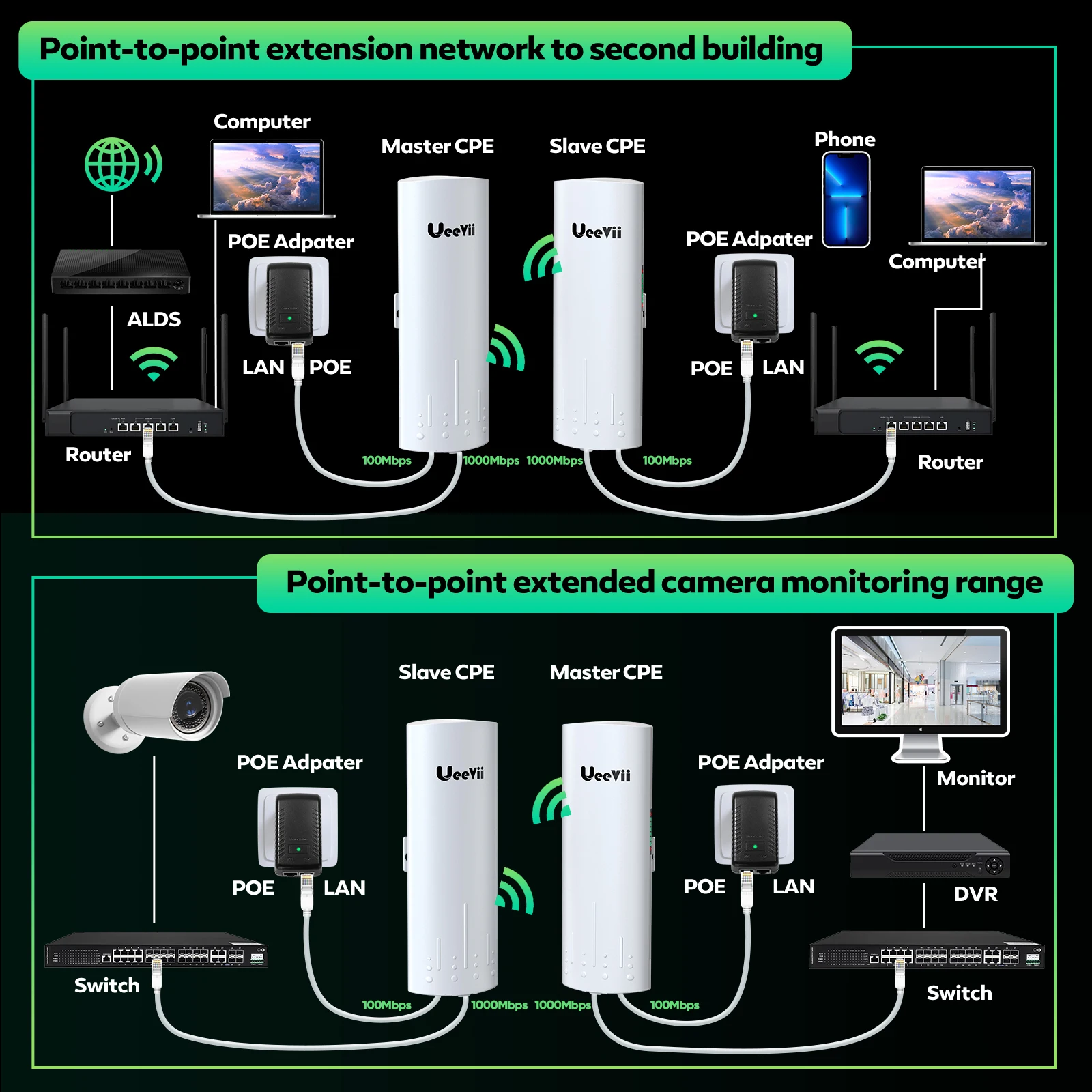 1000Mpbs digital display wireless bridge, transmission/receiver automatic networking, support point-to-point, point-to-multipoint, transmission/receiver flexible switching. WDS networking mode, video network dual compatible. The transmission speed between 2 bridges max is 1200Mbps. The highest network speed that can be achieved max is 1Gbps.