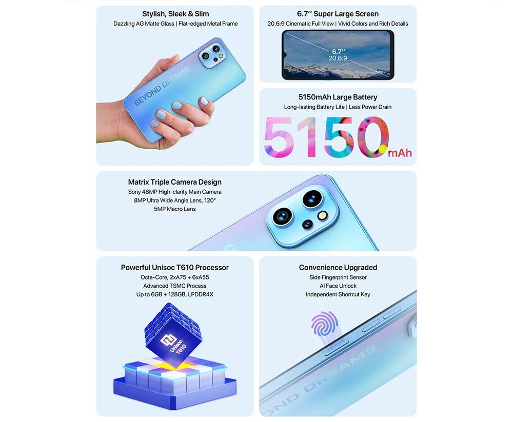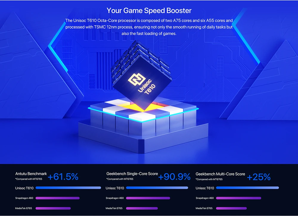 CPU -----------Unisoc T610, Octa-Core, 2xCortex-A75 & 6xCortex-A55, 1.8GHz
