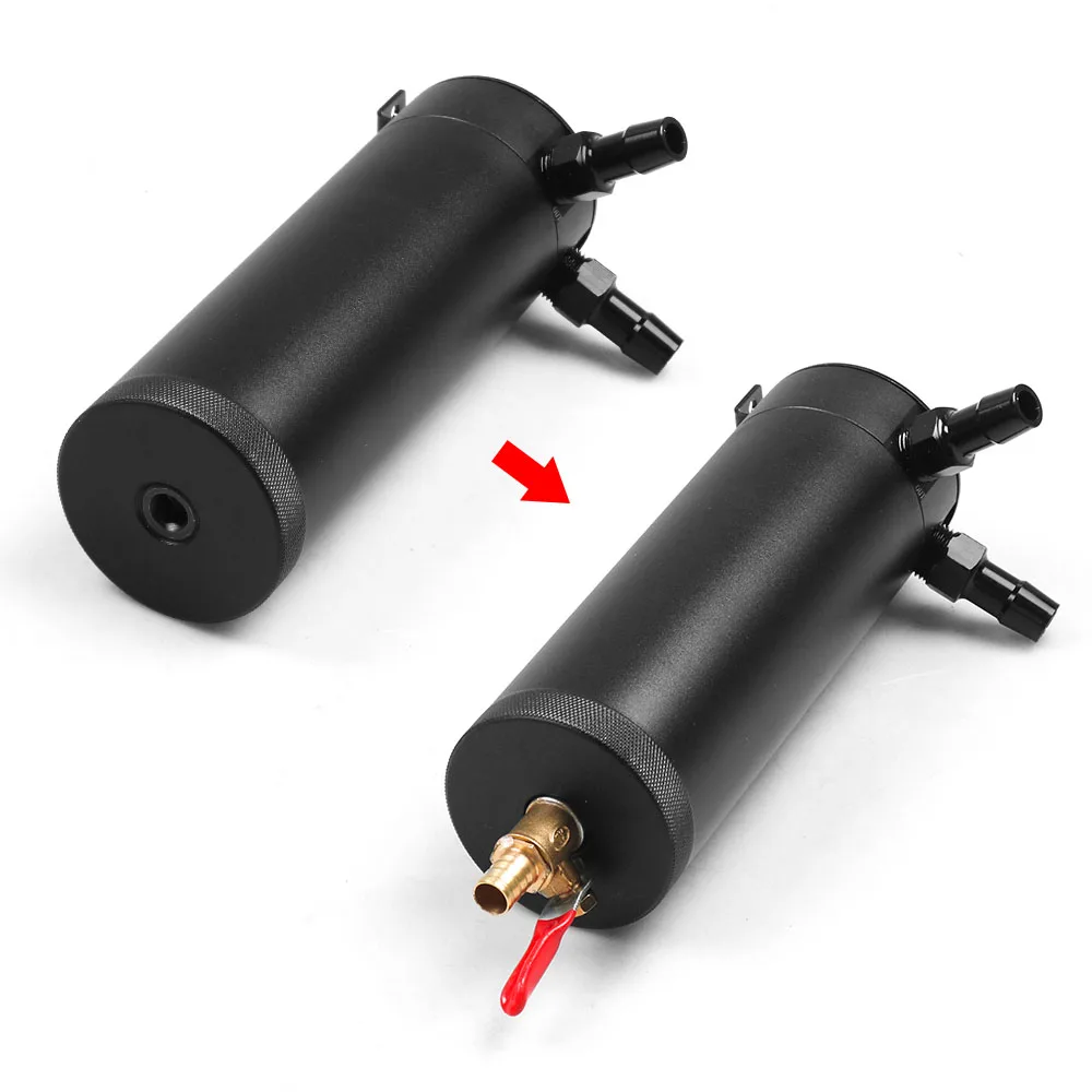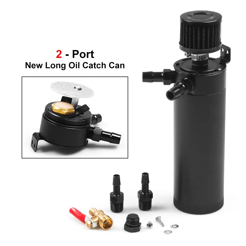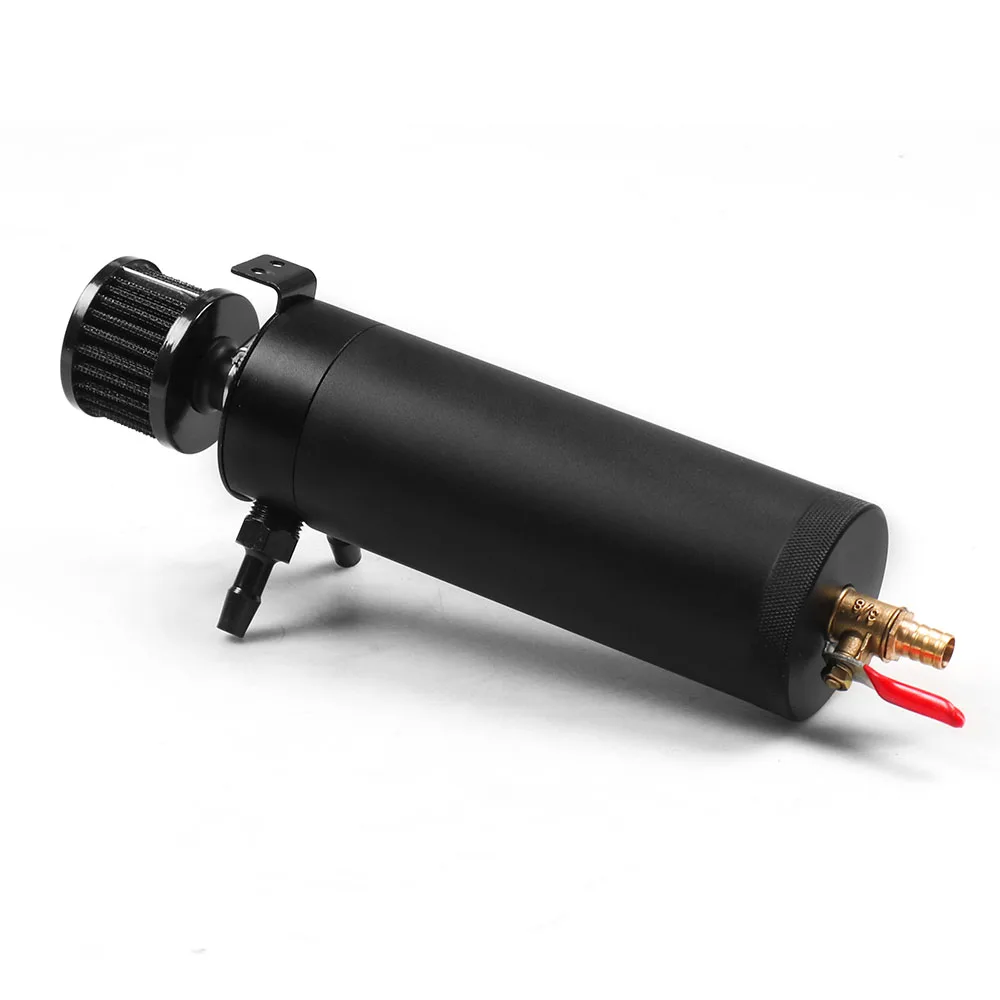 Oil Catch Can Breather Tank Black Breather filter adjustable mounting bracket Petcock Drainer left side port inlet Right side port outlet Included hose barbs: 9.5mm and 12.7mm plug adapter is included if the breather filter is not need.