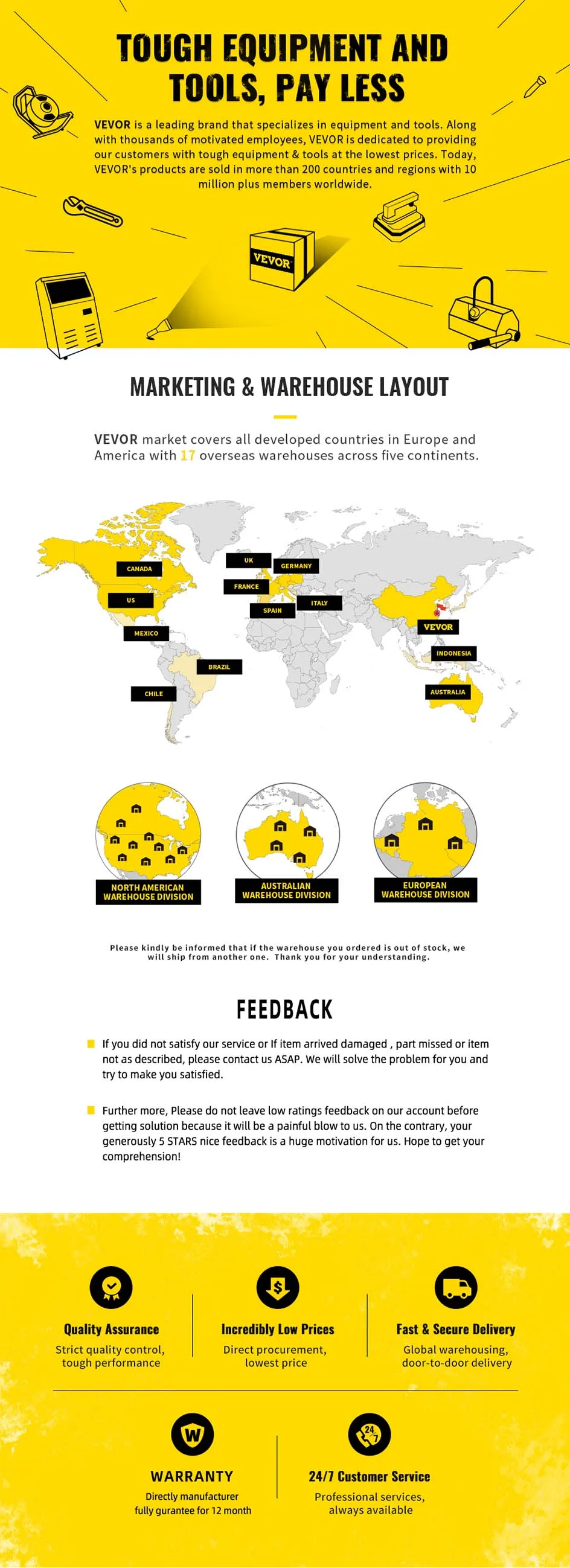 Tough Equipment & Tools, Pay LessVEVOR is a leading brand that specializes in equipment and tools. Along with thousands of motivated employees, VEVOR is dedicated to providing our customers with tough equipment & tools at incredibly low prices. Today, VEVOR has occupied markets of more than 200 countries with 10 million plus global members.Why Choose VEVOR?Premium Tough Quality