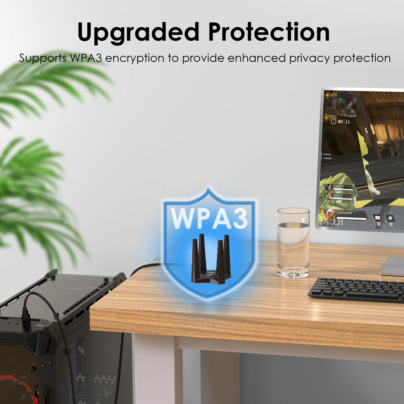 Secure your personal data with the newest WPA3 encryption, even if your PC is connected to a public network via the adapter. Also backward compatible with WPA2/WPA encryption.