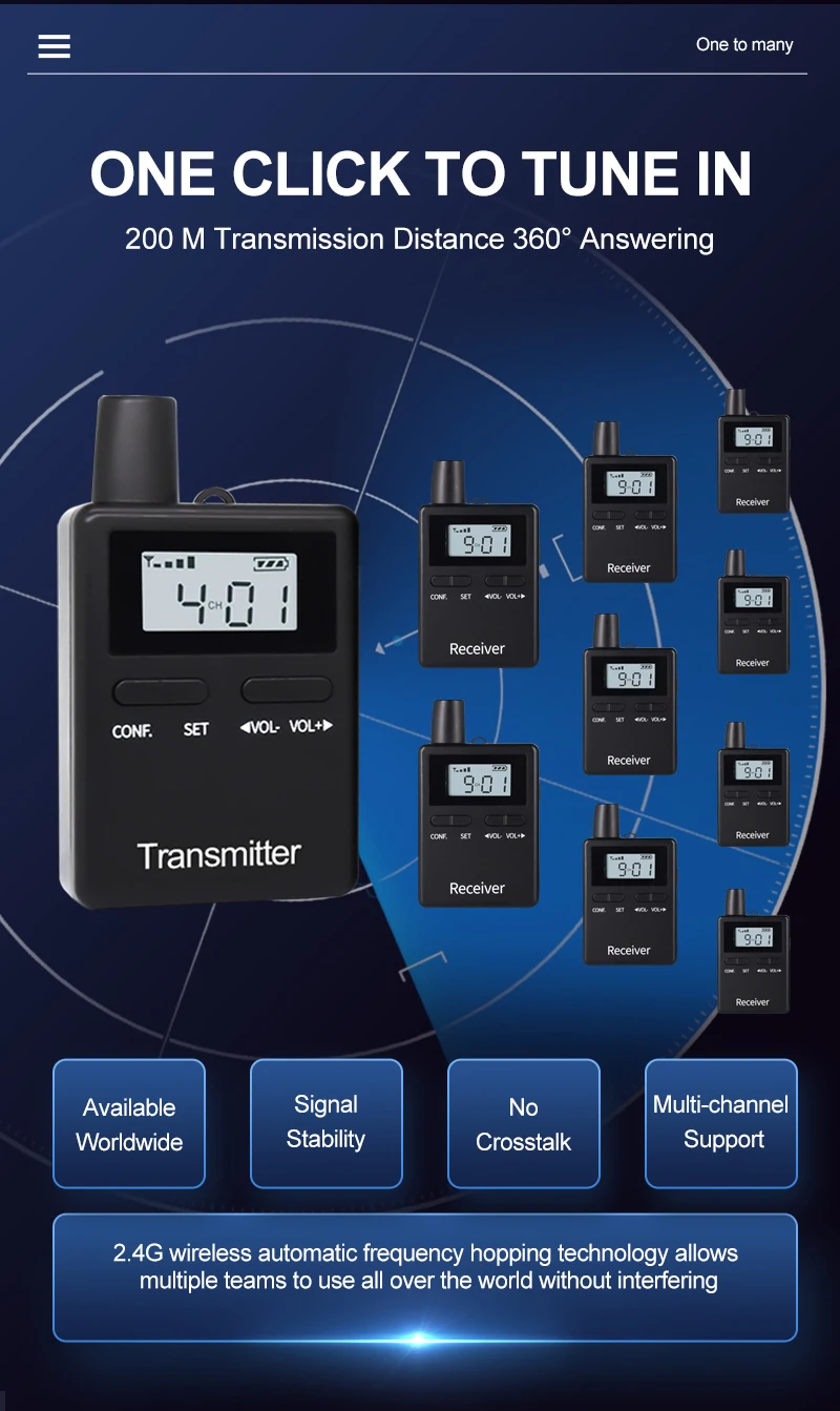 9. Application:Tourism,Haji & Umrah,Tour guide, Wireless meeting, Wireless teaching, Simultaneous interpreting, Corporate hospitality, Factory tour, Church sermon, etc..