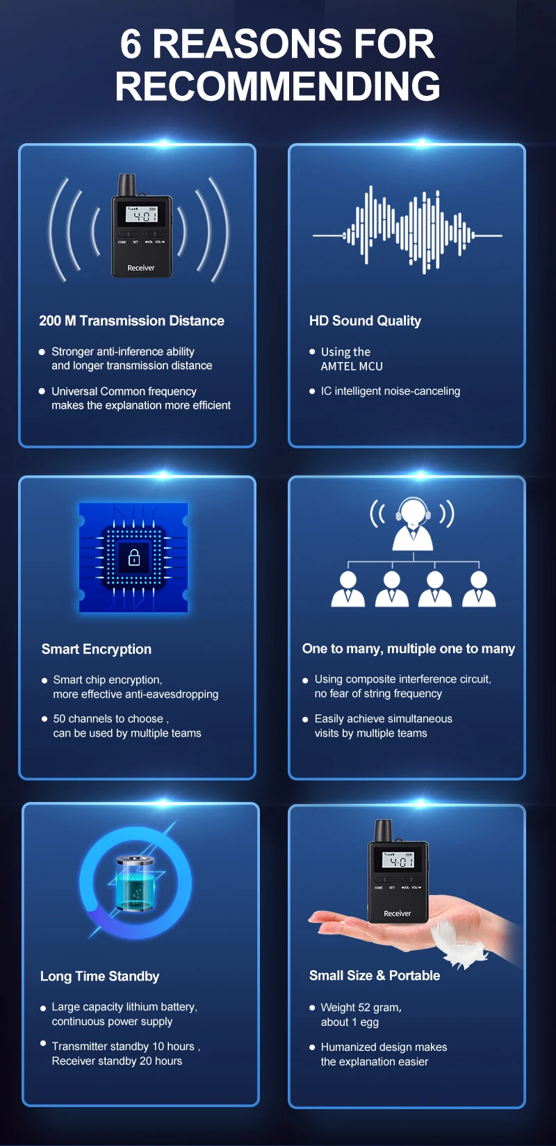 5. 20 channels to choose, up to 50 groups tour at the same location