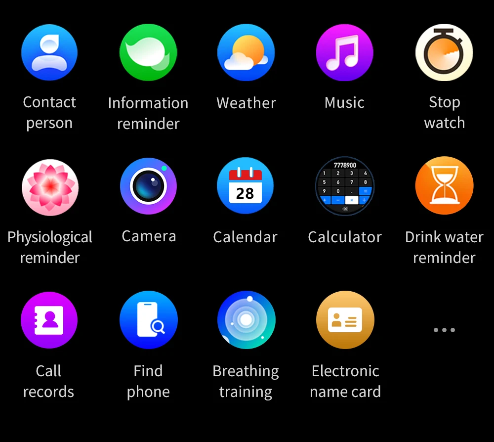 Health monitoring:Heart rate monitoring, blood pressure monitoring, sleep monitoring,Blood oxygen monitoring,Women's health reminder