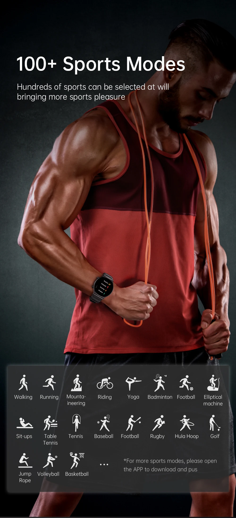 100+ Sports Mode:Running, Walking, Cycling, Breathing Training, Free Training, Plank, Rope Skipping, Yoga, Hill Climbing, Hiking, Spinning, Rowing, Stepper, Elliptical, Basketball, Tennis, Badminton, Soccer, Baseball, Rugby........