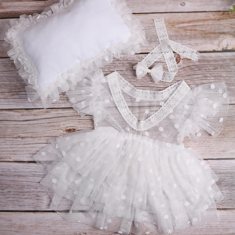Ylsteed 3 Pieces Set Newborn Lace Romper with Posing Pillow Hairband Baby Girl Photography Outfits Infant Dot Mesh Dress