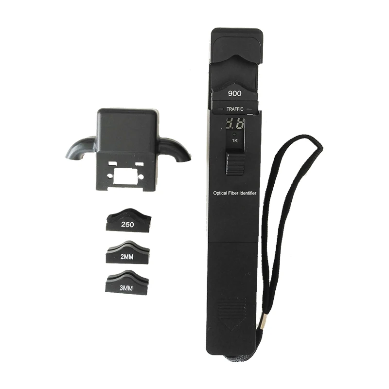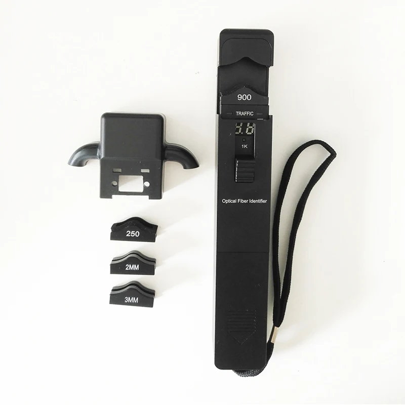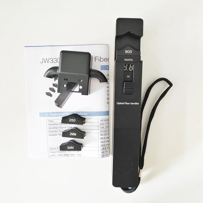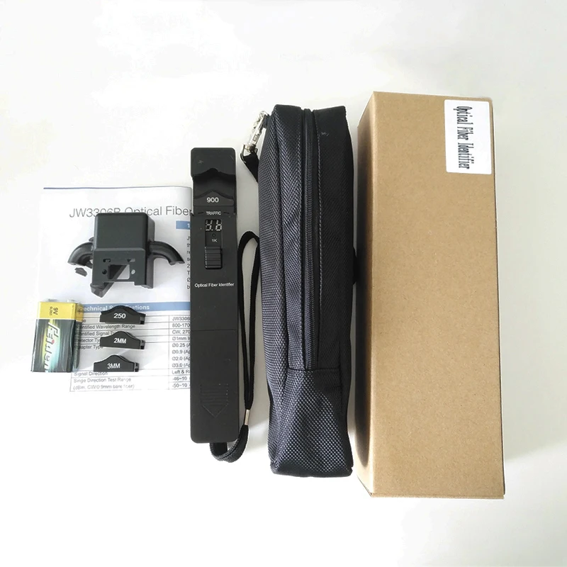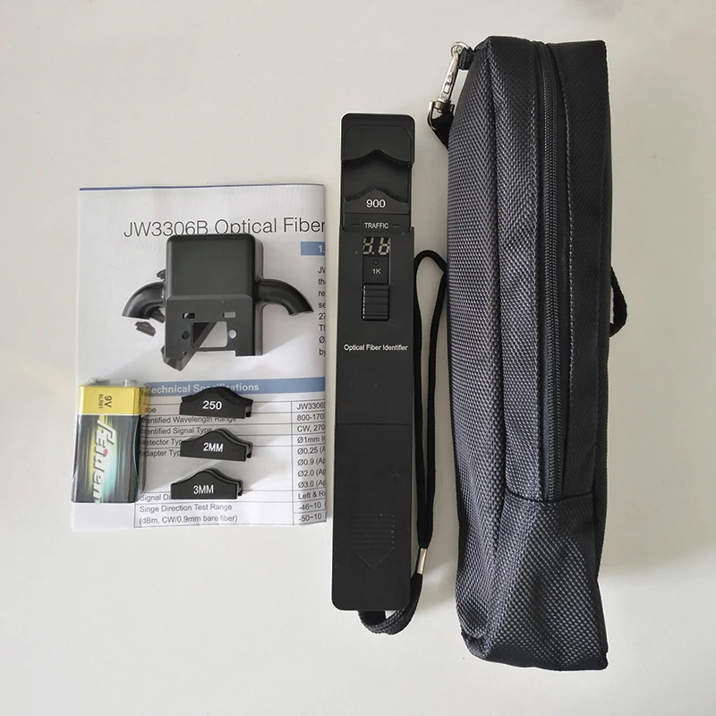 The JW3306B optical fiber identifier also recognize the modulation like,270Hz,1kHz and 2kHz .When they are used to detect the frequency, the continuously audible tone is activated.There are four adapter heads available: 0.25, 0.9, 2.0 and 3.0. The JW3306B optical fiber identifier is powered by a 9V alkaline battery .